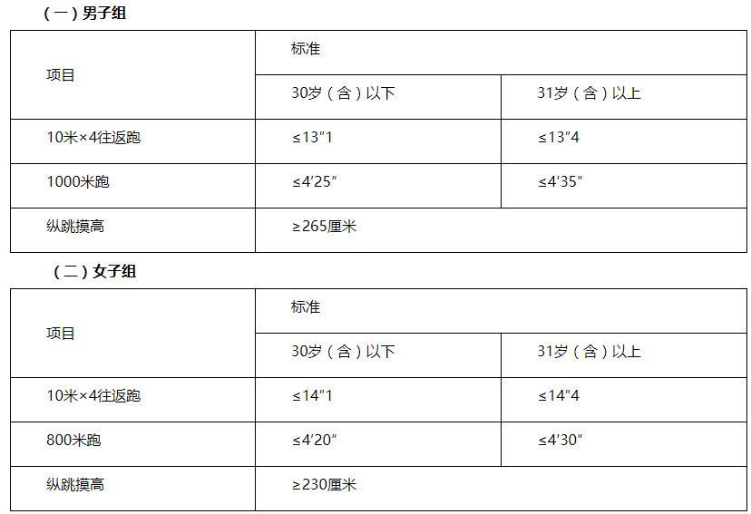 體能測評三項全部達(dá)標(biāo)方為合格。體能測評項目中,縱跳摸高的測試次數(shù)不超過3次,10米×4往返跑的測試次數(shù)不超過2次,長跑項目(男子1000米、女子800米)的測試次數(shù)為1次。
