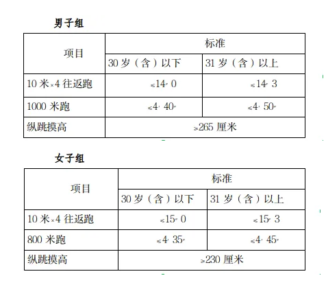 參照《關(guān)于印發(fā)公安機(jī)關(guān)錄用人民警察體能測評(píng)項(xiàng)目和標(biāo)準(zhǔn)(暫行)的通知》(人社部發(fā)〔2011〕48號(hào))的項(xiàng)目及測試規(guī)則,結(jié)合《公安民警體育鍛煉達(dá)標(biāo)手冊(cè)》成績標(biāo)準(zhǔn),本次體能測評(píng)的項(xiàng)目和標(biāo)準(zhǔn)如下: