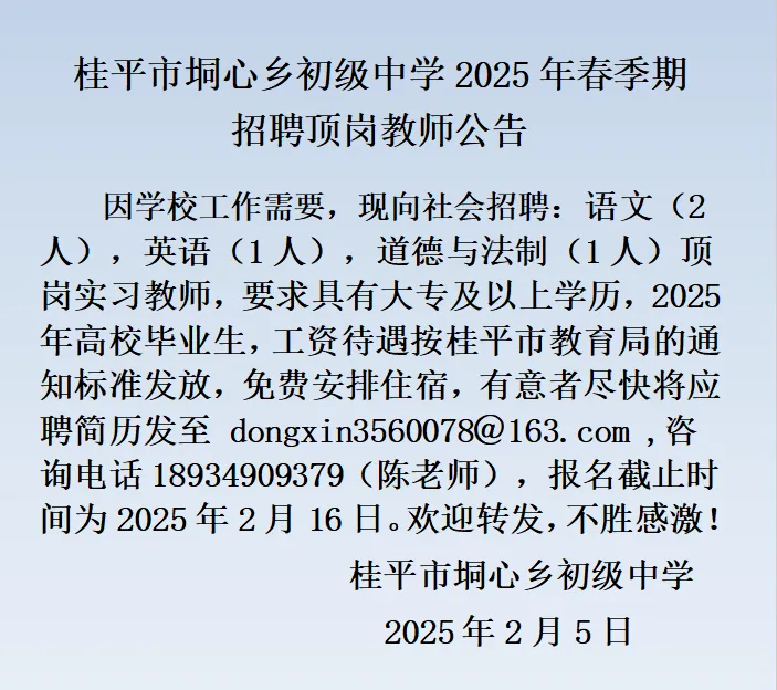2025年春季學(xué)期貴港桂平市垌心鄉(xiāng)初級(jí)中學(xué)招聘頂崗教師公告