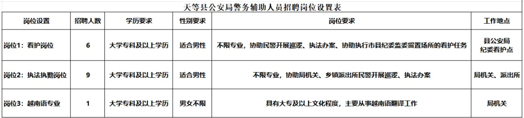 附件1:天等縣公安局警務(wù)輔助人員招聘崗位設(shè)置表