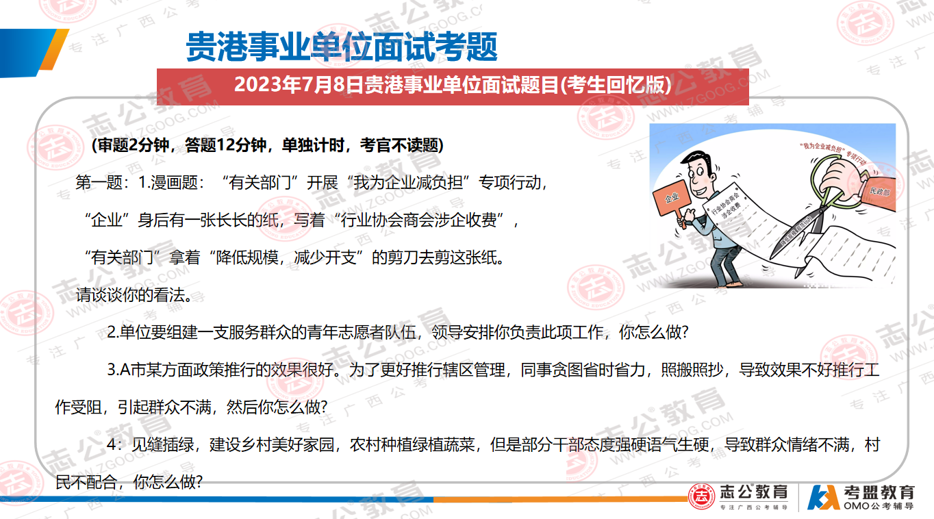 貴港事業(yè)單位面試主要采用結(jié)構(gòu)化面試形式;審題時(shí)間:2分鐘;答題時(shí)間:12分鐘;考查題量:4題為主。考務(wù)情況:考官不讀題、統(tǒng)一計(jì)時(shí)、超時(shí)會(huì)提醒??疾轭}型:綜合分析(極高)、計(jì)劃組織(極高)、人際溝通(極高)、應(yīng)急應(yīng)變(較高)、貫徹執(zhí)行(較高)、自我認(rèn)知(一般)。