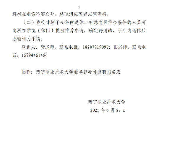 2025年廣西南寧職業(yè)技術(shù)大學(xué)招聘校級教學(xué)督導(dǎo)員2人
