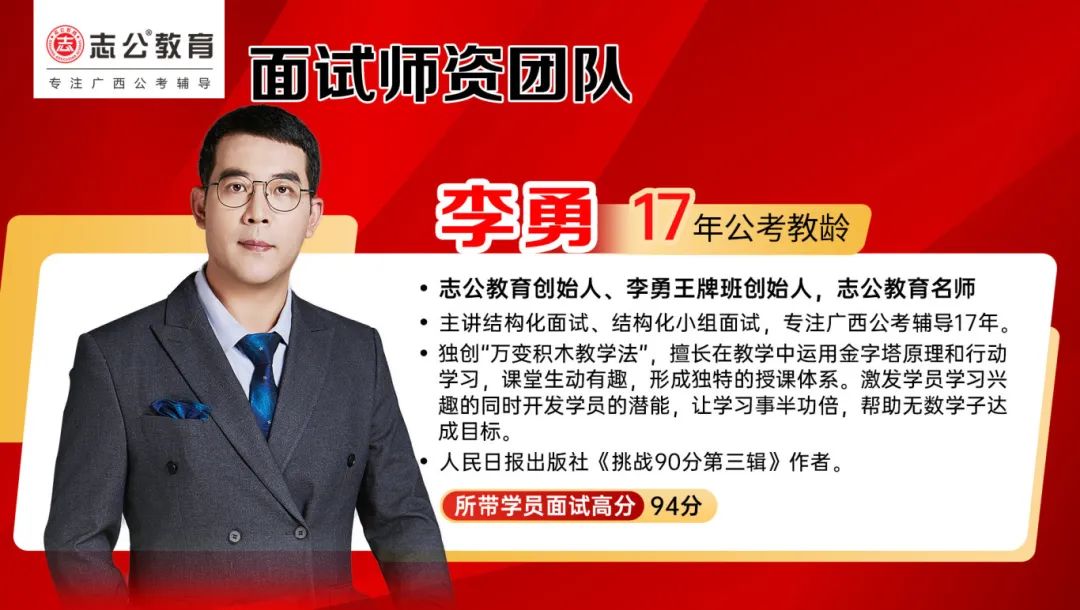 李勇——志公教育創(chuàng)始人、李勇王牌®班創(chuàng)始人,志公教育名師。主講結(jié)構(gòu)化面試、結(jié)構(gòu)化小組面試,專注廣西公考輔導(dǎo)17年。獨創(chuàng)“萬變積木教學(xué)法”,擅長在教學(xué)中運用金字塔原理和行動學(xué)習(xí),課堂生動有趣,形成獨特的授課體系。激發(fā)學(xué)員學(xué)習(xí)興趣的同時開發(fā)學(xué)員的潛能,讓學(xué)習(xí)事半功倍,幫助無數(shù)學(xué)子達(dá)成目標(biāo)。同時也是人民日報出版社《挑戰(zhàn)90分第三輯》作者。