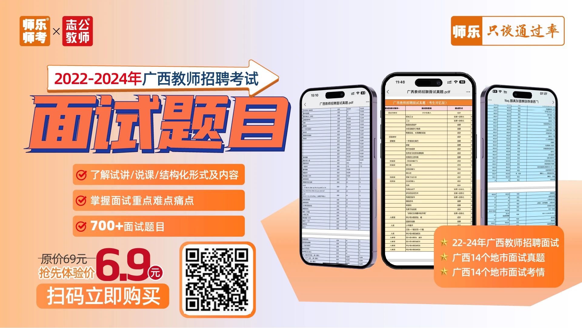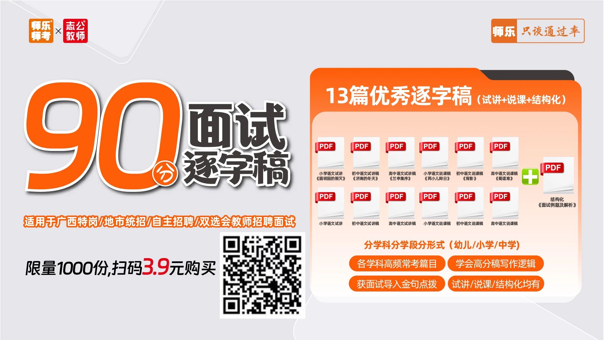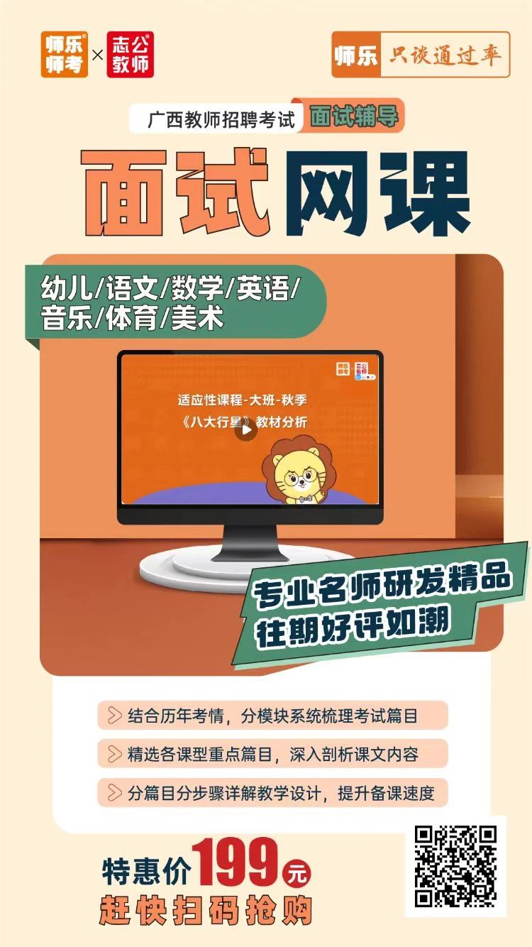 特惠價(jià):199元 ?結(jié)合歷年考情,分模塊系統(tǒng)梳理考試篇目 ?分篇目分步驟詳解教學(xué)設(shè)計(jì),提升備課速度 毫無(wú)思路怎么辦? 缺乏知識(shí)儲(chǔ)備怎么辦? 網(wǎng)課將精選核心課型 深入進(jìn)行教材梳理 網(wǎng)課內(nèi)容示例 ↓↓ 搶先體驗(yàn)價(jià):3.9元 ??語(yǔ)/數(shù)/英/幼/音/體/美/文綜/理綜 ??各學(xué)科高頻常考篇目 ??寫(xiě)作邏輯+面試導(dǎo)入金句點(diǎn)撥 ?含13+篇試講+說(shuō)課+結(jié)構(gòu)化 搶先體驗(yàn)價(jià):6.9元 ??14地市教招面試zhen題 了解試講/說(shuō)課/結(jié)構(gòu)化形式及內(nèi)容 面試禮儀課 ??面試禮儀干貨介紹 正反面案例直觀對(duì)比 ??著裝、問(wèn)候、儀態(tài)、言談禮儀等事項(xiàng)介紹 【師樂(lè)】廣西教招備考群 ??最新公告 備考資料 ??刷題打卡 考試交流