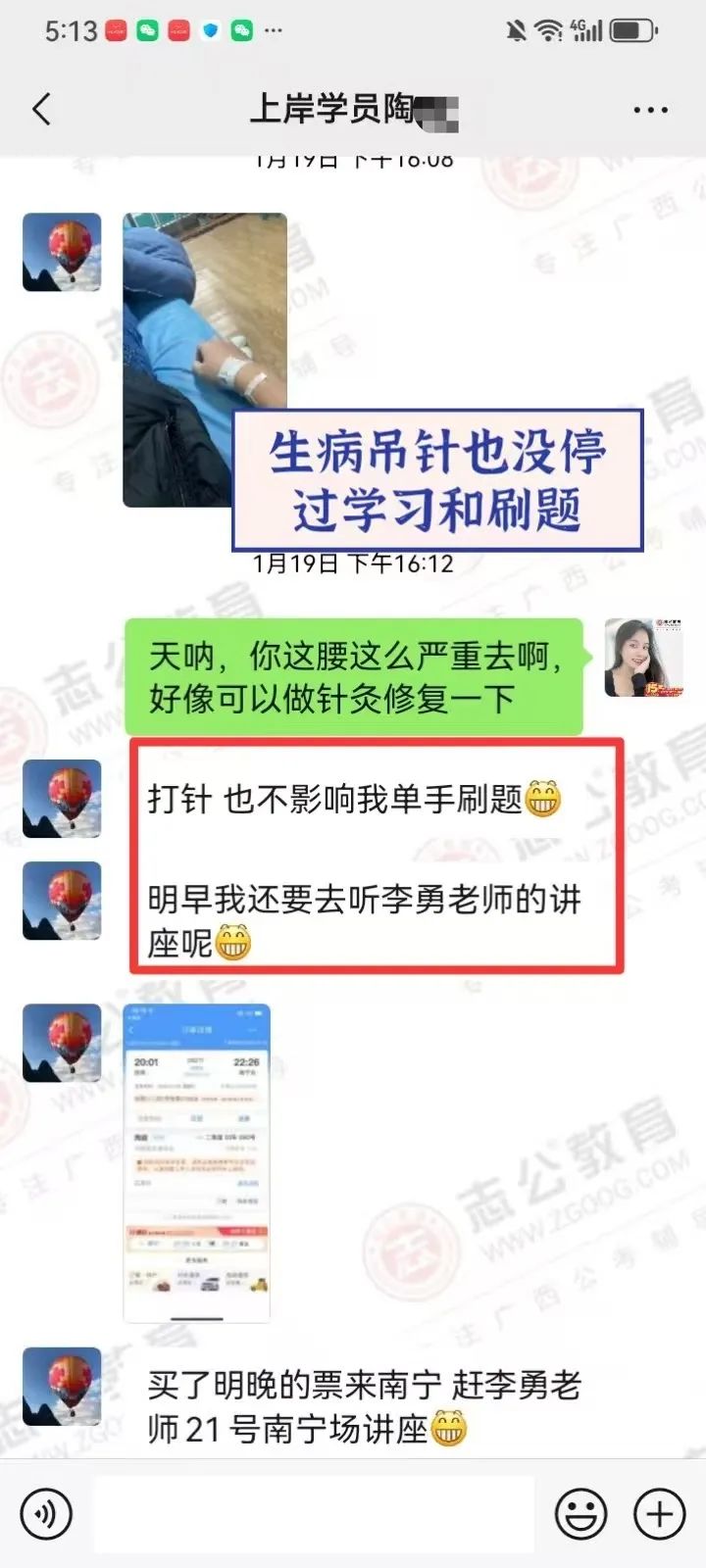 在備考的日子里,無數(shù)個(gè)夜晚,我看到他朋友圈發(fā)的經(jīng)常學(xué)習(xí)練習(xí)到教室關(guān)門最后一個(gè)才回家,無數(shù)次往返南寧和桂林兩座城市,只為家庭和研究生學(xué)業(yè)和公務(wù)員備考的有序進(jìn)行,讓我印象最深的一次,就是他微信拍了一張正在打針輸液的照片發(fā)給我,還打趣的跟我說:還好不影響我單手刷題! 即使學(xué)員因?yàn)樯眢w過于勞累導(dǎo)致生病在吊針,也絲毫沒有懈怠過學(xué)習(xí),讓我非常的佩服和感動。