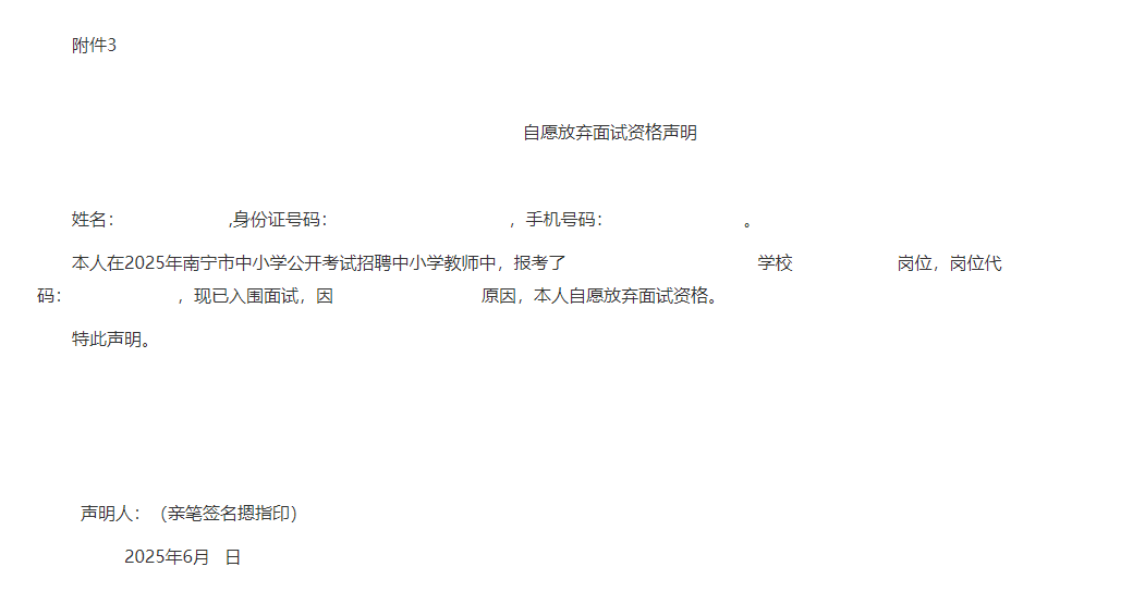 (四)放棄面試資格的報考人員,應及時向面試資格復審單位提供書面放棄面試資格說明材料(詳見附件3,包含:報考單位、崗位名稱和代碼、注明身份證號碼、手機號碼、本人簽名捺手印,材料可傳真或掃描發(fā)送郵箱:rs8223408@126.com),否則按相關規(guī)定處理。
