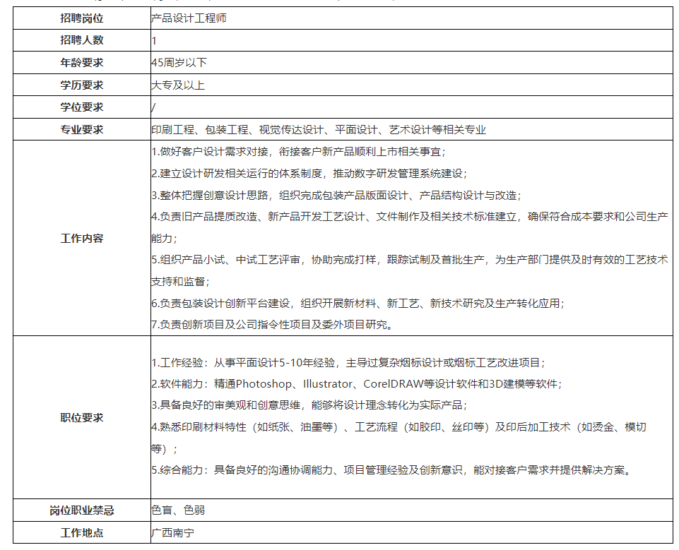 公司以創(chuàng)新引領(lǐng)發(fā)展,公司先后獲得“全國(guó)印刷示范企業(yè)”、“中國(guó)煙標(biāo)印刷行業(yè)最具實(shí)力十大領(lǐng)軍企業(yè)”、“廣西制造業(yè)企業(yè)50強(qiáng)”,連續(xù)三年獲得“廣西優(yōu)秀企業(yè)”、“賀州市億元納稅企業(yè)”等榮譽(yù)稱號(hào)。公司秉承以人為本的理念,尊重人才、重視人才,開(kāi)展員工職業(yè)發(fā)展規(guī)劃,為每一位員工提供廣闊的發(fā)展機(jī)會(huì),充分發(fā)揮員工自主性和創(chuàng)造性。根據(jù)公司發(fā)展需要,現(xiàn)面向社會(huì)公開(kāi)招聘員工。具體事項(xiàng)公告如下: