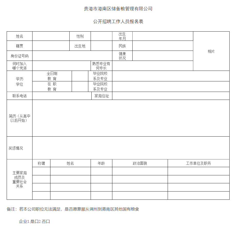 附件:貴港市港南區(qū)儲(chǔ)備糧管理有限公司公開(kāi)招聘工作人員報(bào)名表