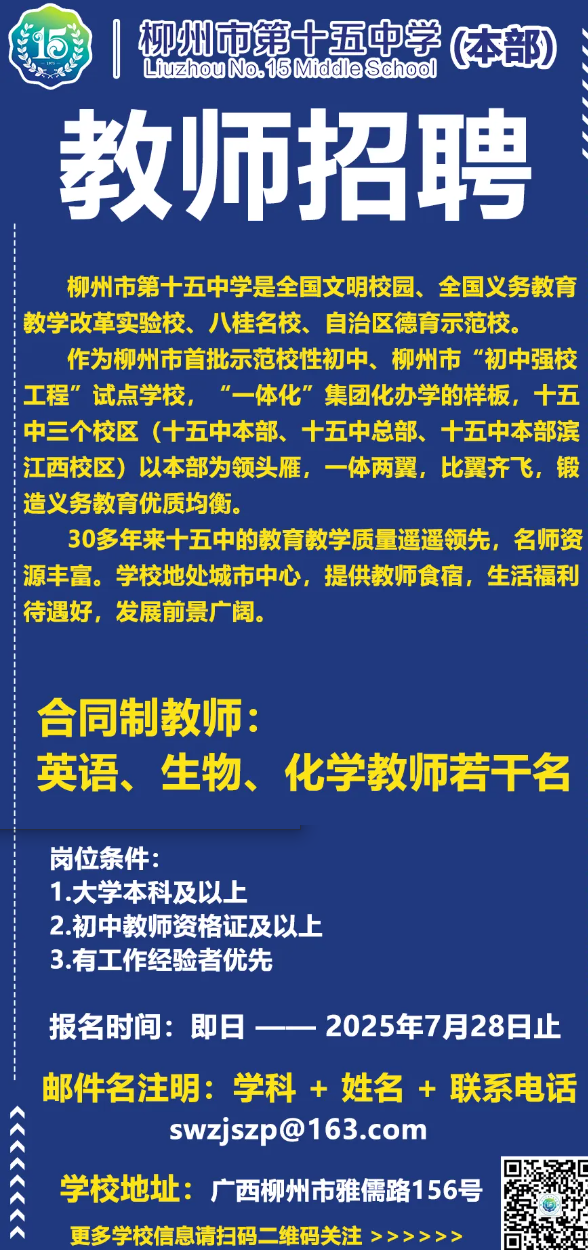 2025年柳州市第十五中學(xué)本部誠(chéng)聘英才若干名