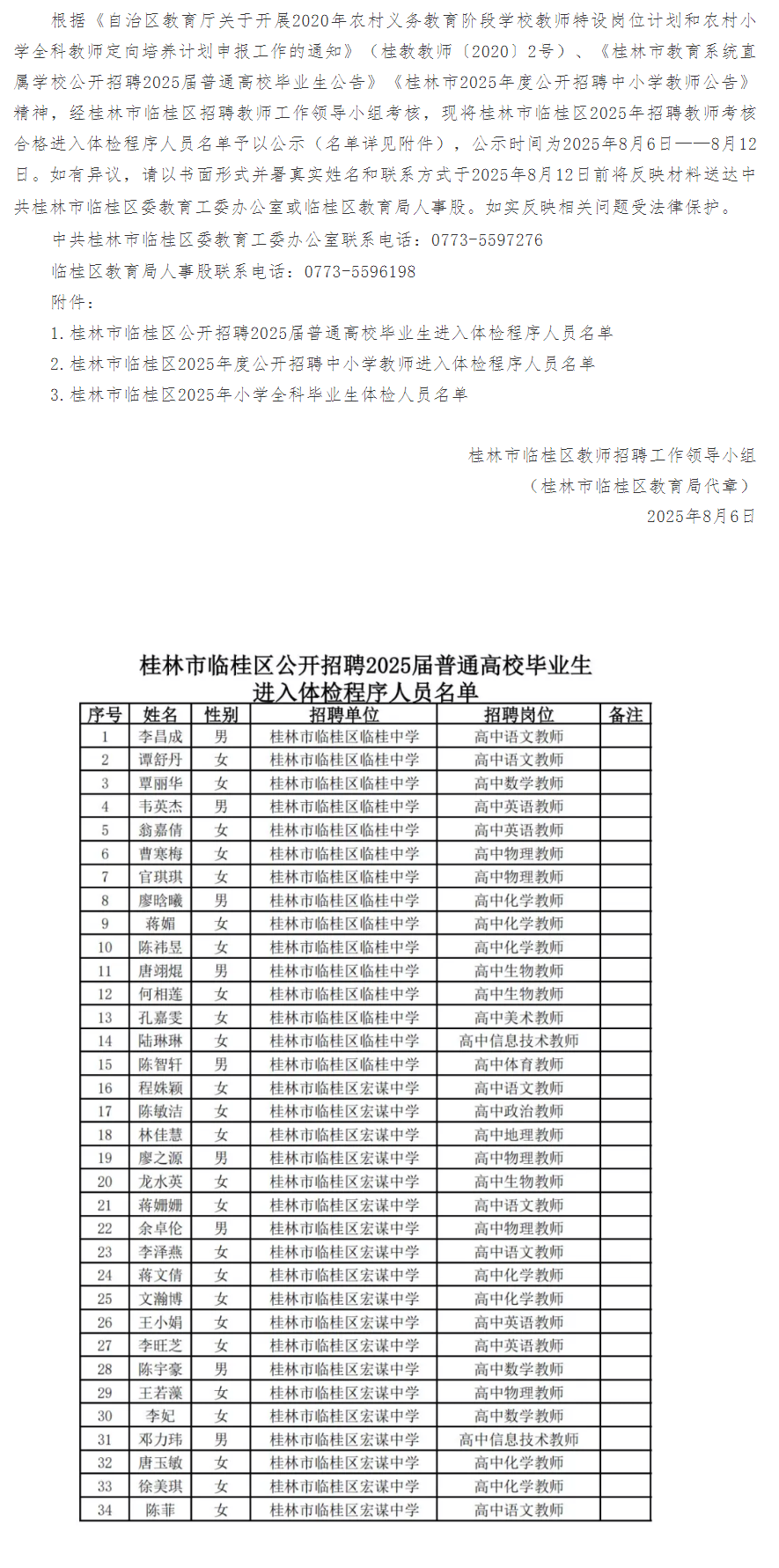 文章來源:桂林市臨桂區(qū)2025年招聘教師考核合格進(jìn)入體檢程序人員名單公示