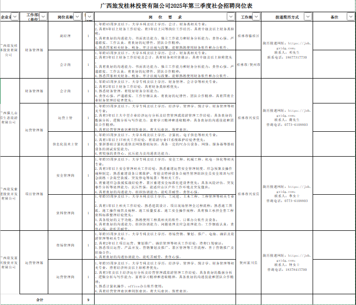 廣旅桂林投資公司有關(guān)崗位員工9名(詳見附件)。