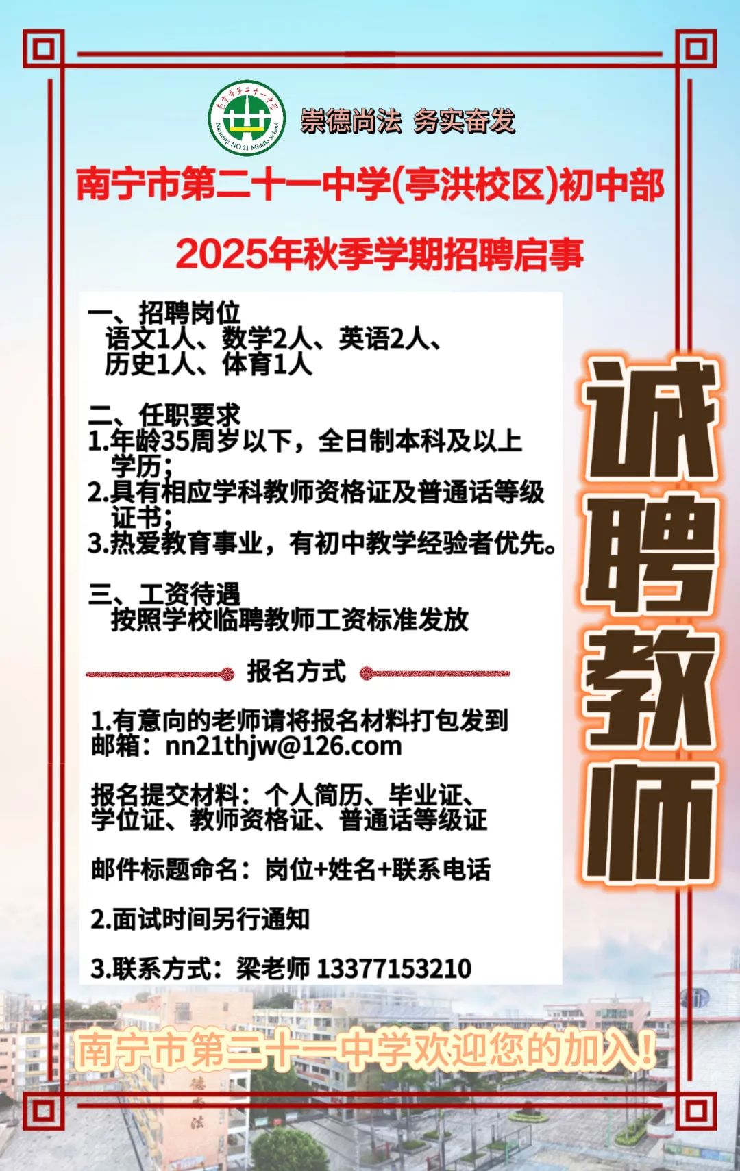 2025年南寧市第二十一中學(亭洪校區(qū))初中部秋季學期招聘啟事