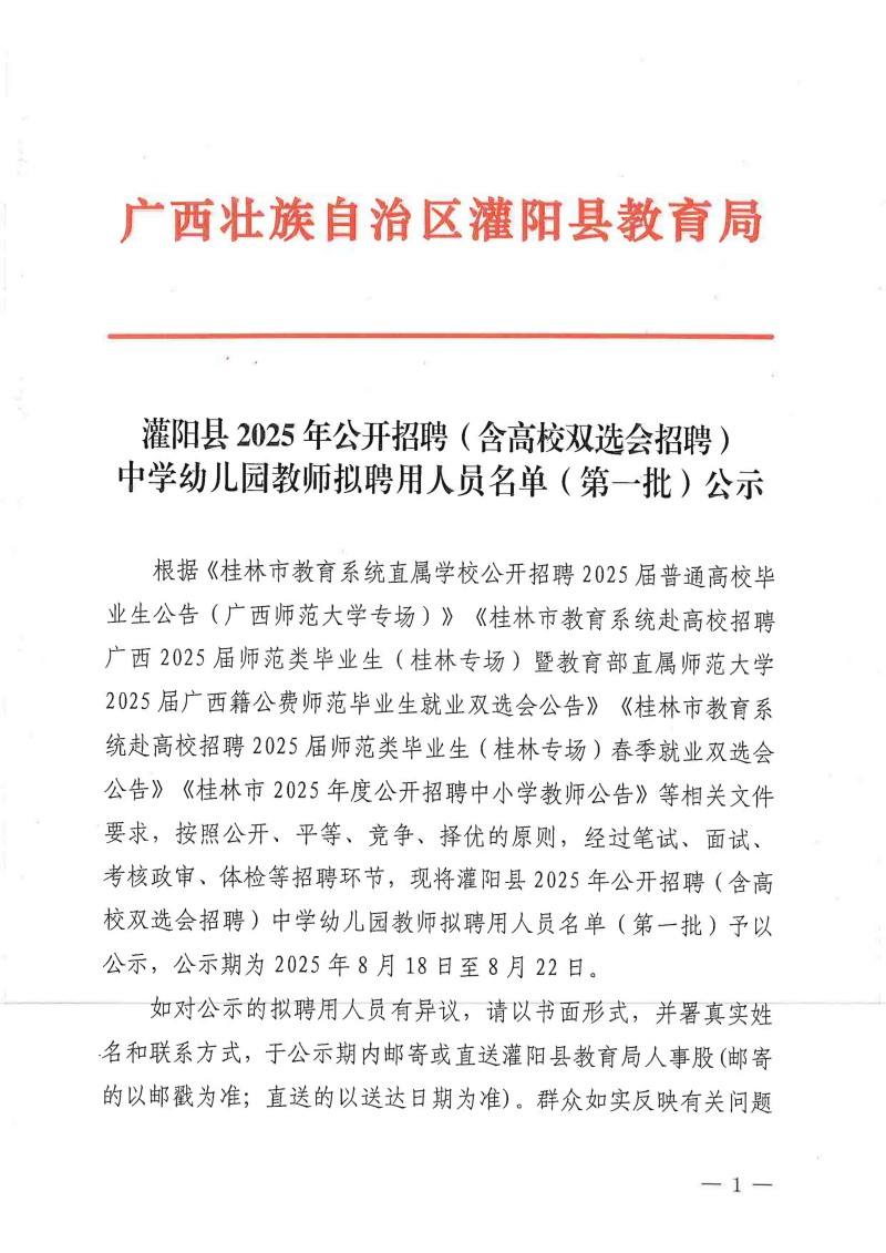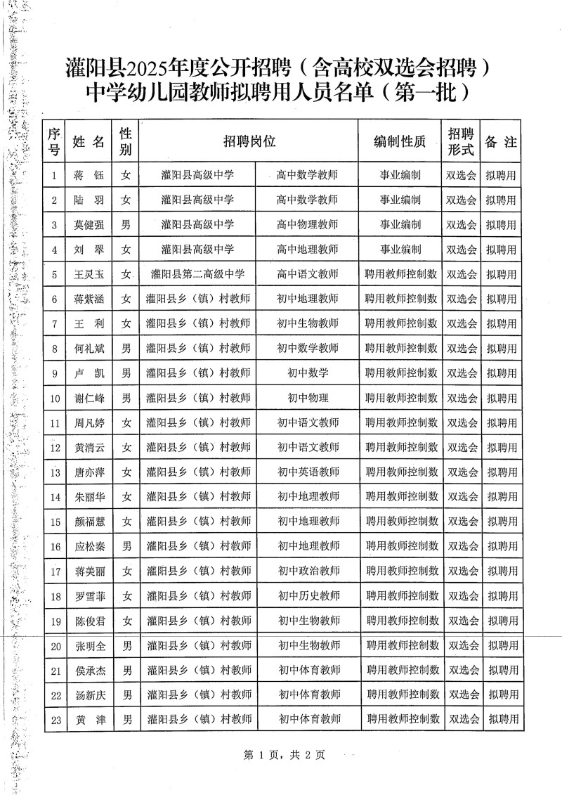 灌陽縣2025年公開招聘(含高校雙選會招聘)中學(xué)幼兒園教師擬聘用人員名單(第一批)公示