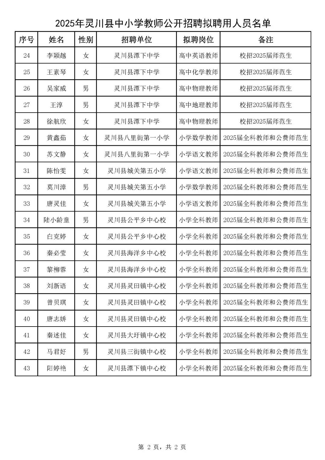 2025年靈川縣中小學教師公開招聘擬聘用人員名單公示