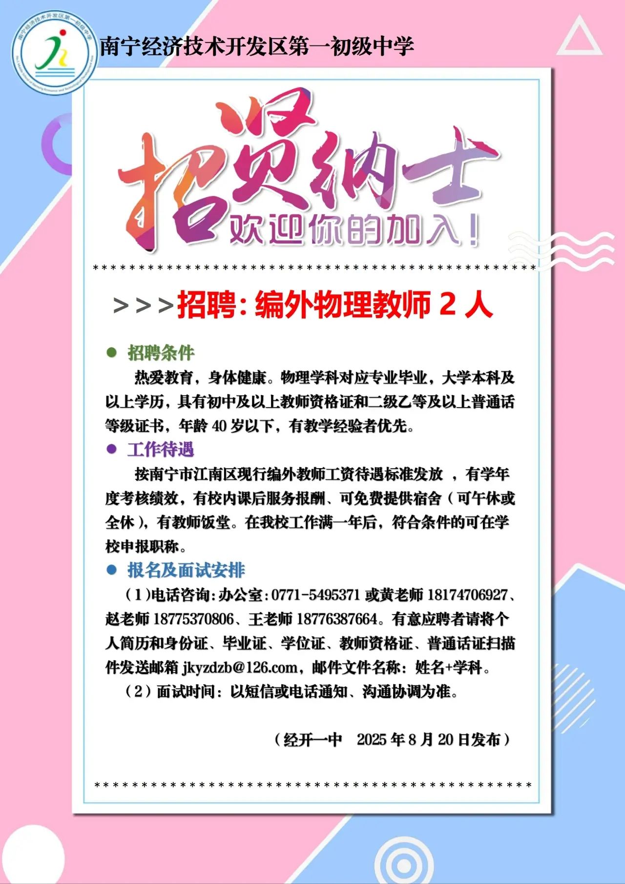 2025年南寧經(jīng)濟(jì)技術(shù)開(kāi)發(fā)區(qū)第一初級(jí)中學(xué)招聘物理教師