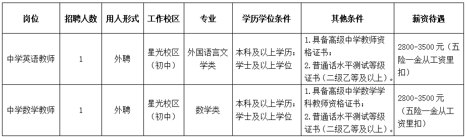 根據(jù)學(xué)校工作需要,南寧市第十中學(xué)星光校區(qū)(初中部)面向社會(huì)招聘教職工,具體崗位如下:
