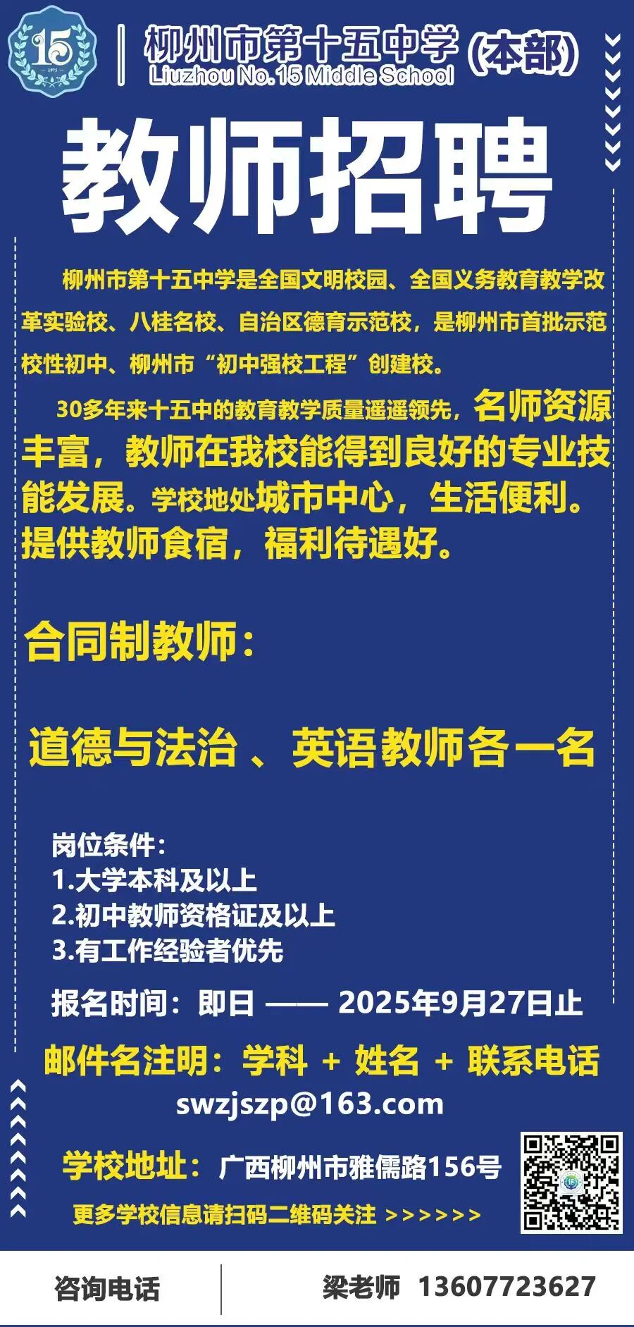 2025年柳州市第十五中學本部招聘公告