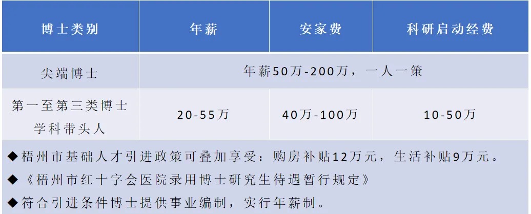 博士研究生學(xué)歷學(xué)位的急需緊缺專業(yè)人才:享受醫(yī)院引進(jìn)博士待遇20-200萬元/年,實(shí)行年薪制待遇一人一議,提供科研啟動(dòng)經(jīng)費(fèi)10萬-50萬元,疊加享受梧州市人才引進(jìn)補(bǔ)助,安家費(fèi)52-125萬元,生活補(bǔ)貼9-12萬元。