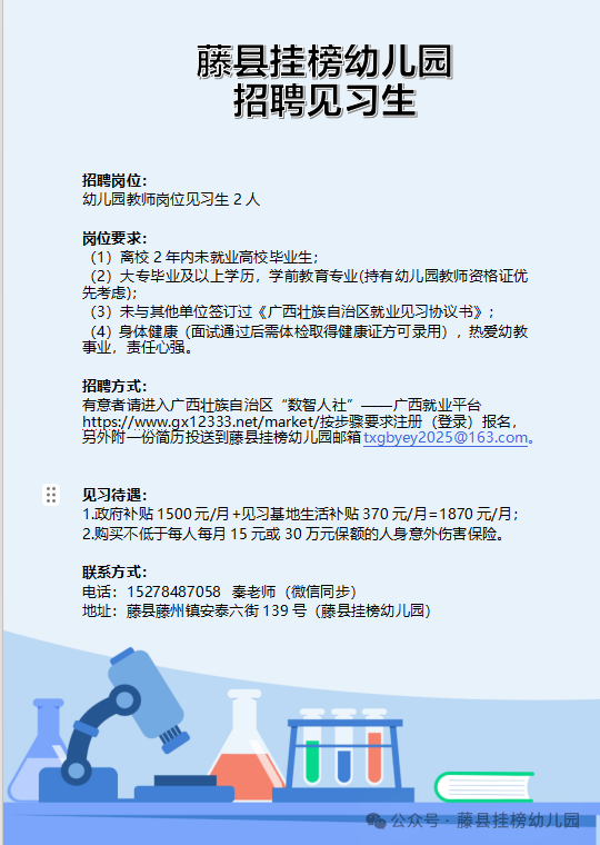 原文標題:藤縣掛榜幼兒園2026年春學期招聘見習老師公告