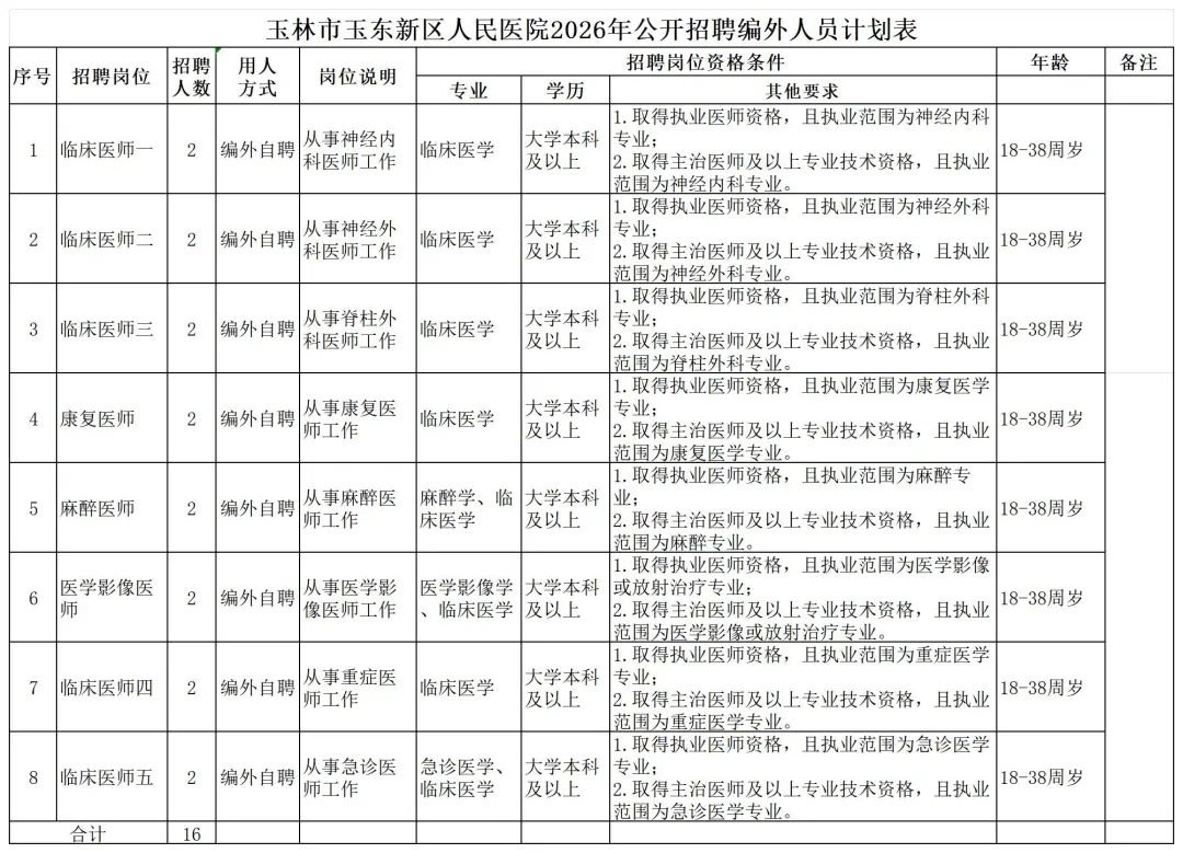 2026年玉林市玉東新區(qū)人民醫(yī)院公開招聘醫(yī)師16人
