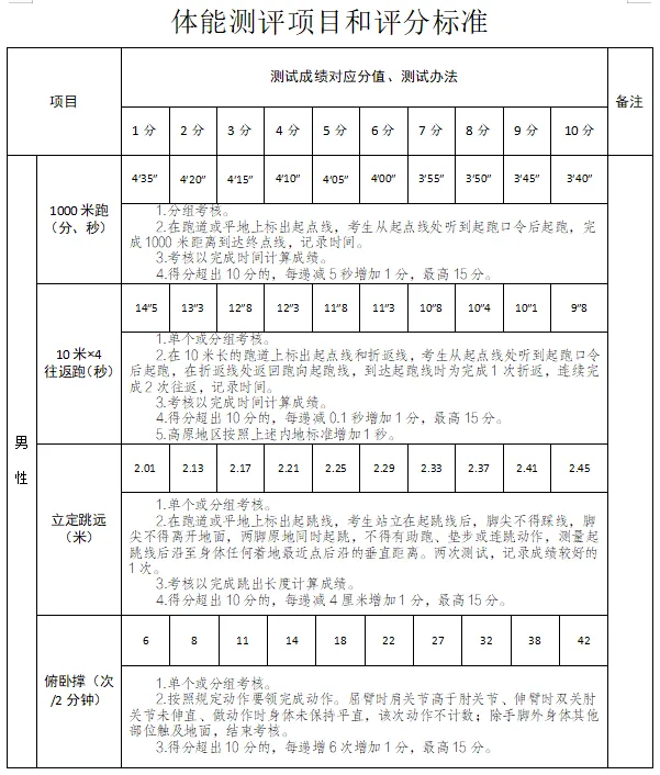 任一單項(xiàng)得分為0的視為“不合格”,予以淘汰。體能測(cè)評(píng)所有項(xiàng)目均只測(cè)試一次。(標(biāo)準(zhǔn)見(jiàn)附件)