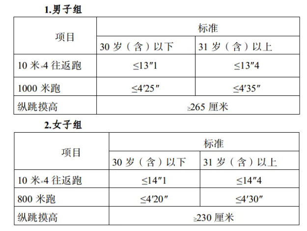 參照《關(guān)于印發(fā)<公安機關(guān)錄用人民警察體能測評項目和標準>的通知》(公政治〔2024〕60號)執(zhí)行,每個測評項目分別記錄成績。其中縱跳摸高的測評次數(shù)不超過3次,10米×4往返跑測評次數(shù)不超過2次,男子1000米跑、女子800米跑測評次數(shù)均為1次。