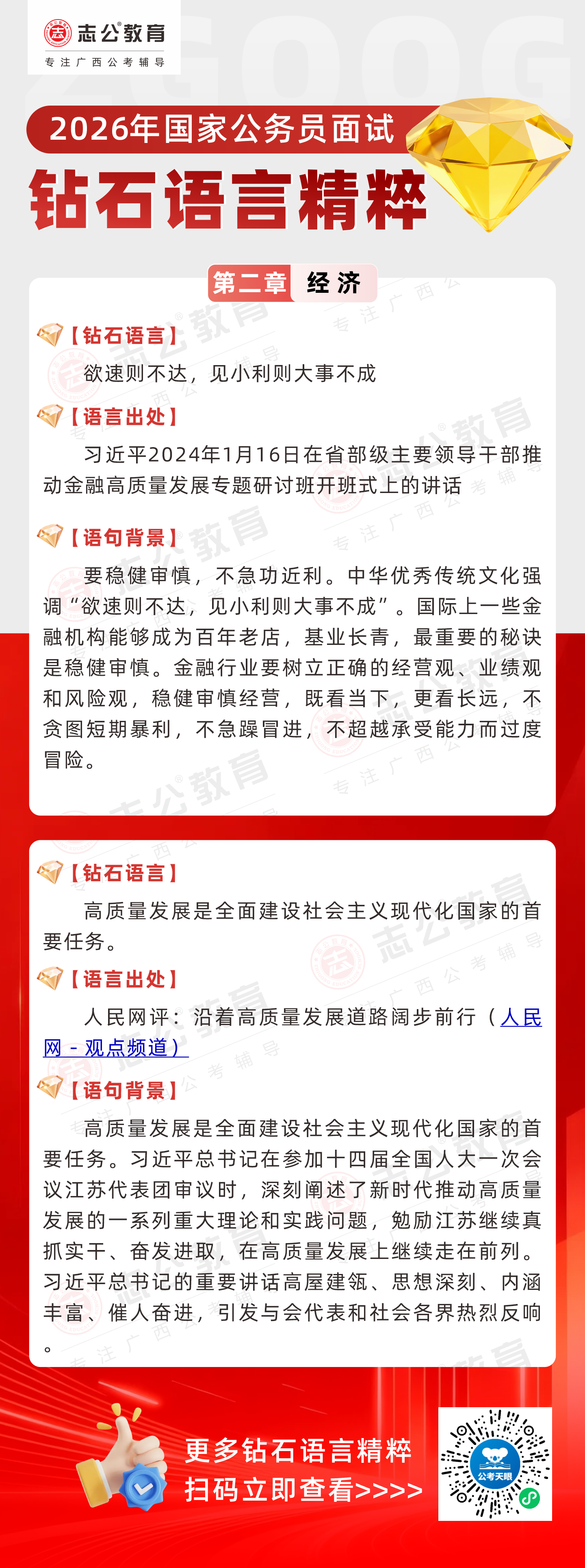 志公教育推出《2026國家公務(wù)員面試·鉆石語言精粹》經(jīng)濟(jì)篇!幫助考生把握經(jīng)濟(jì)類題目應(yīng)答邏輯,提升語言表達(dá)層次,助你在面試中脫穎而出。備考2026國考面試,從掌握“鉆石語言”開始!