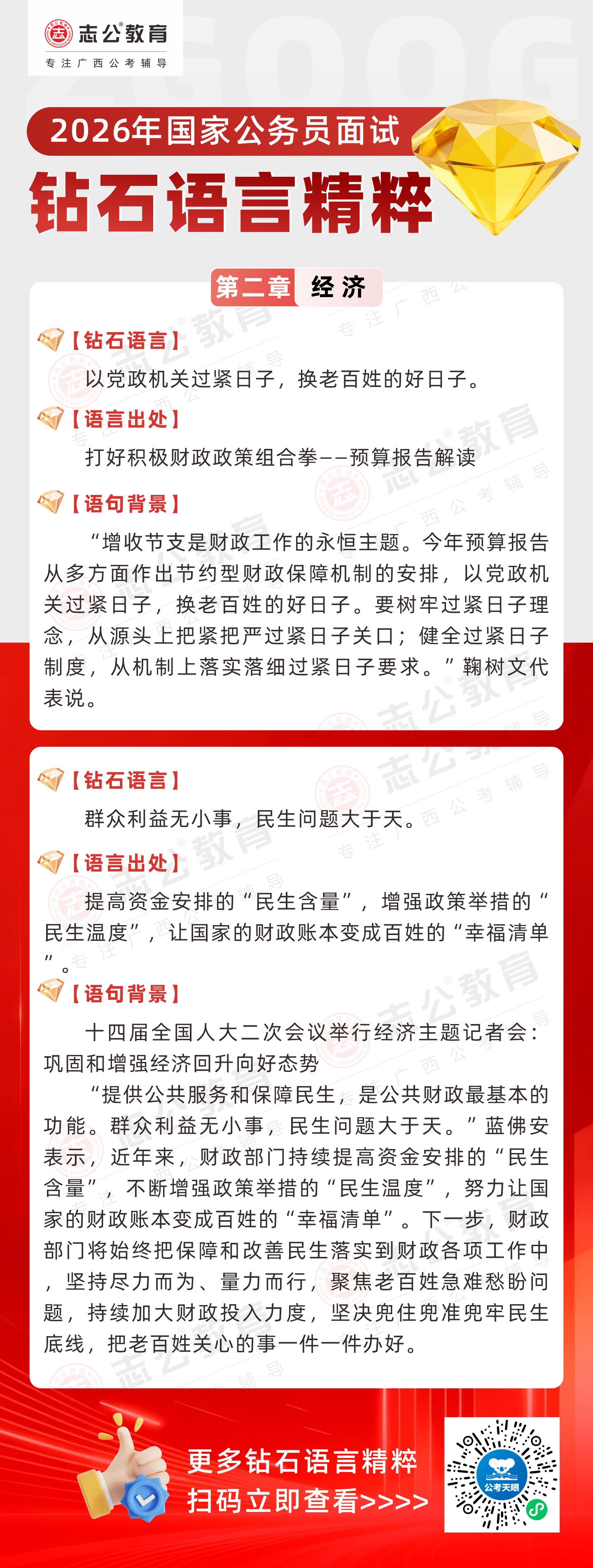 志公教育推出《2026國(guó)家公務(wù)員面試·鉆石語(yǔ)言精粹》經(jīng)濟(jì)篇!幫助考生把握經(jīng)濟(jì)類題目應(yīng)答邏輯,提升語(yǔ)言表達(dá)層次,助你在面試中脫穎而出。備考2026國(guó)考面試,從掌握“鉆石語(yǔ)言”開始!