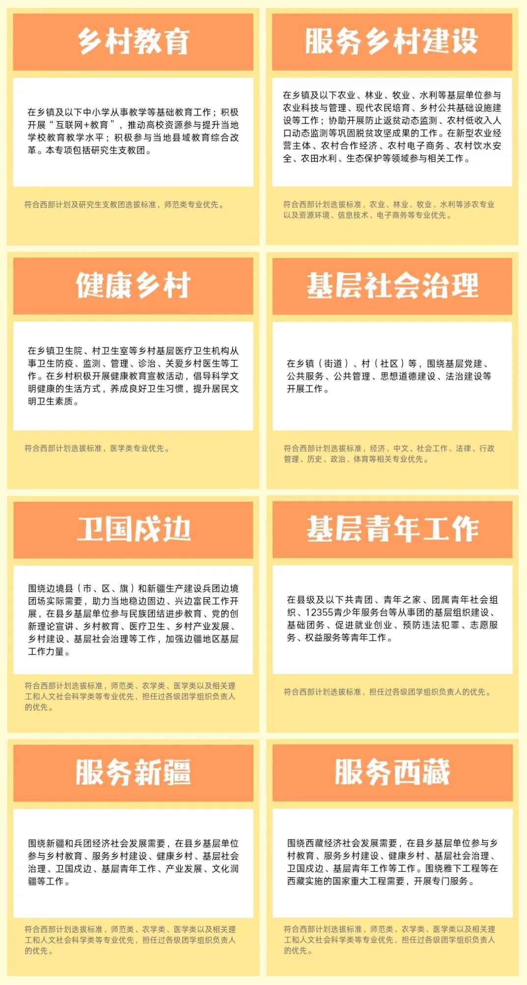 2026年西部計(jì)劃項(xiàng)目將深入貫徹落實(shí)習(xí)近平總書記重要回信精神,引導(dǎo)廣大高校畢業(yè)生積極參加鄉(xiāng)村教育、服務(wù)鄉(xiāng)村建設(shè)、健康鄉(xiāng)村、基層社會(huì)治理、衛(wèi)國戍邊、基層青年工作、服務(wù)新疆、服務(wù)西藏等8個(gè)專項(xiàng),以青春力量服務(wù)國家戰(zhàn)略、服務(wù)百姓民生、服務(wù)社會(huì)治理。今年全國預(yù)計(jì)新招募約6萬人,赴新疆、西藏等27個(gè)?。ㄗ灾螀^(qū)、直轄市)和新疆生產(chǎn)建設(shè)兵團(tuán)的基層一線開展志愿服務(wù),90%以上的服務(wù)崗位在鄉(xiāng)鎮(zhèn)及以下。西部計(jì)劃志愿者服務(wù)期為1至3年,服務(wù)協(xié)議一年一簽。為激勵(lì)志愿者服務(wù)期滿繼續(xù)扎根西部、扎根基層,國家在升學(xué)、就業(yè)、培養(yǎng)等多個(gè)方面給予政策支持。